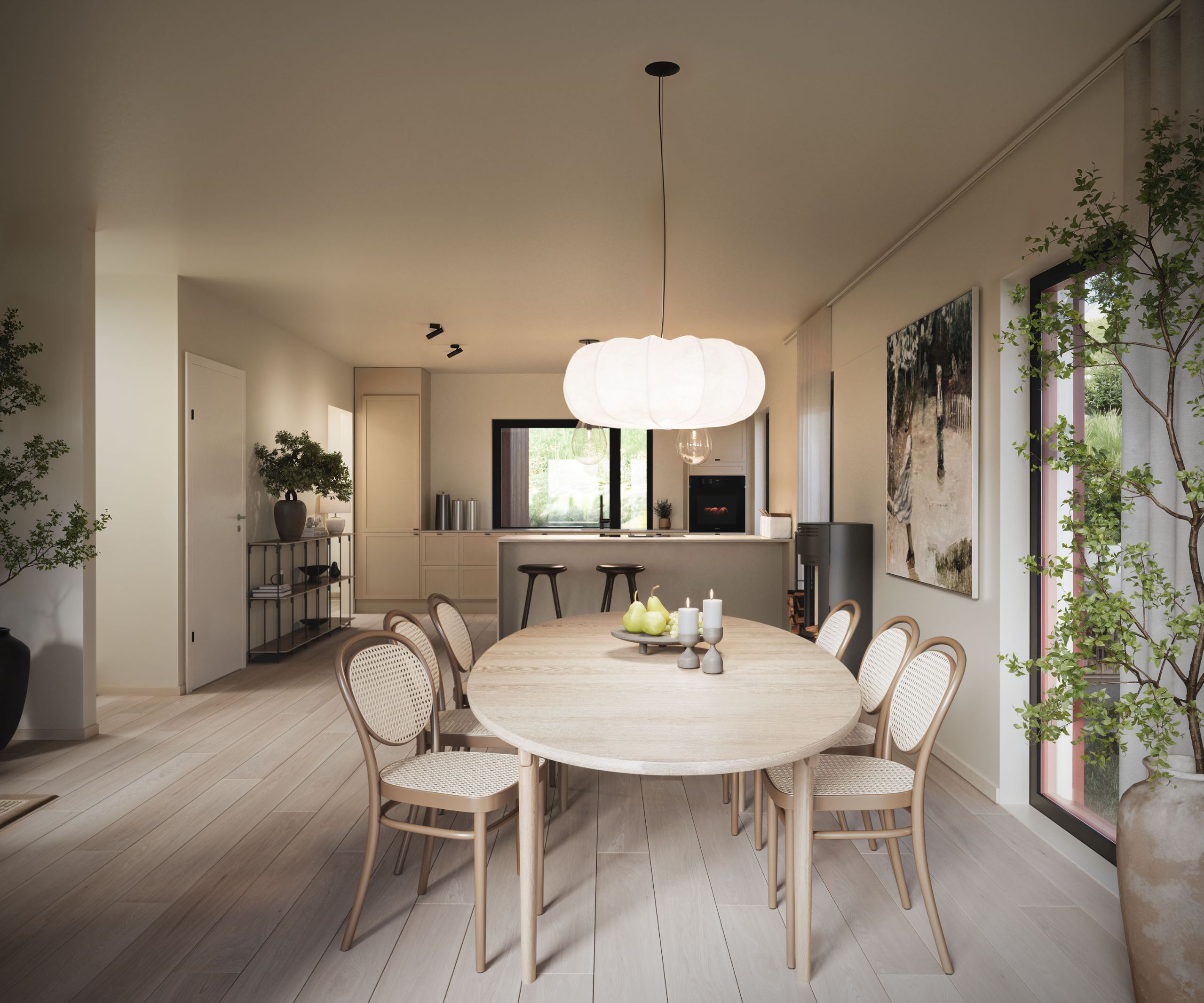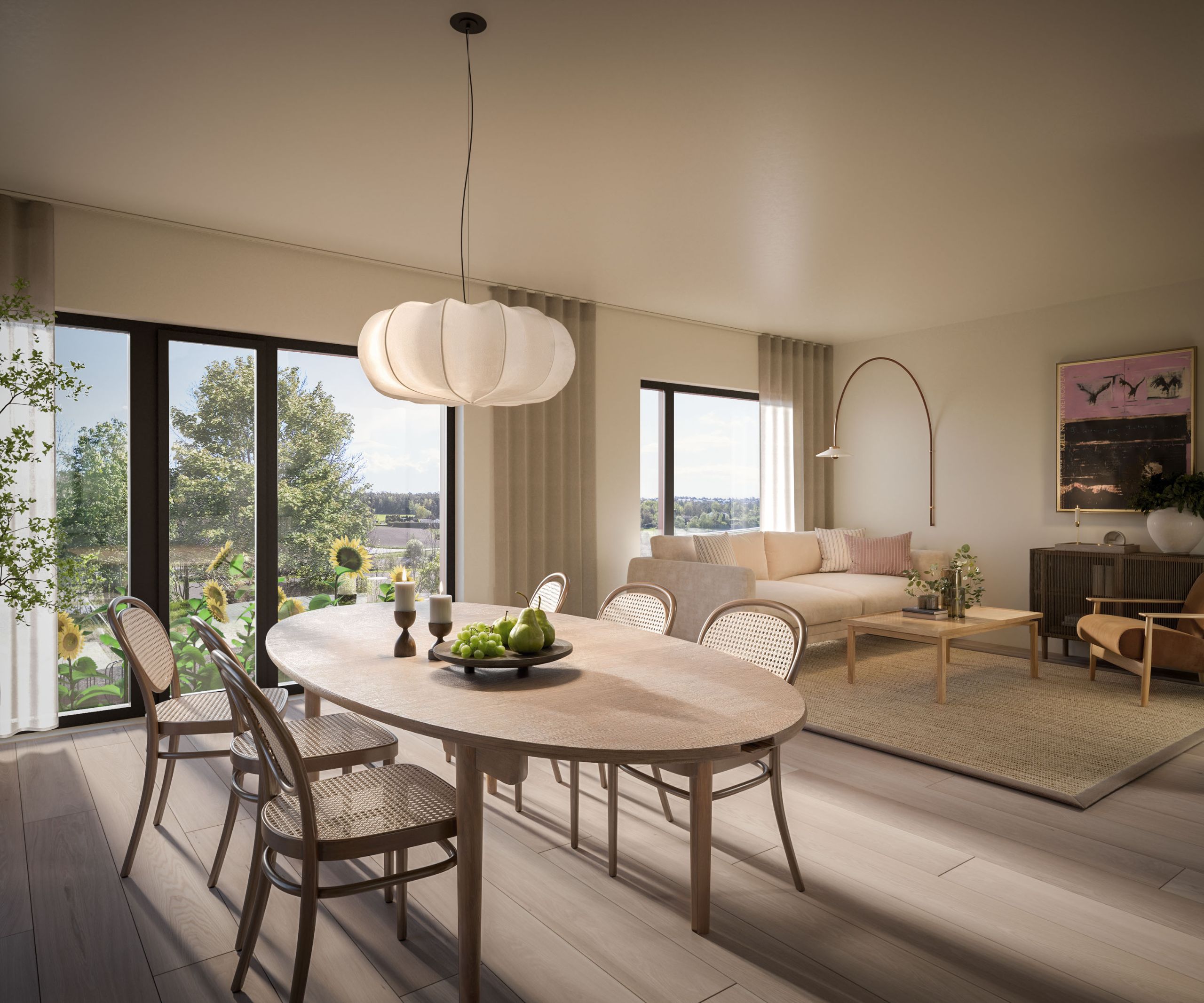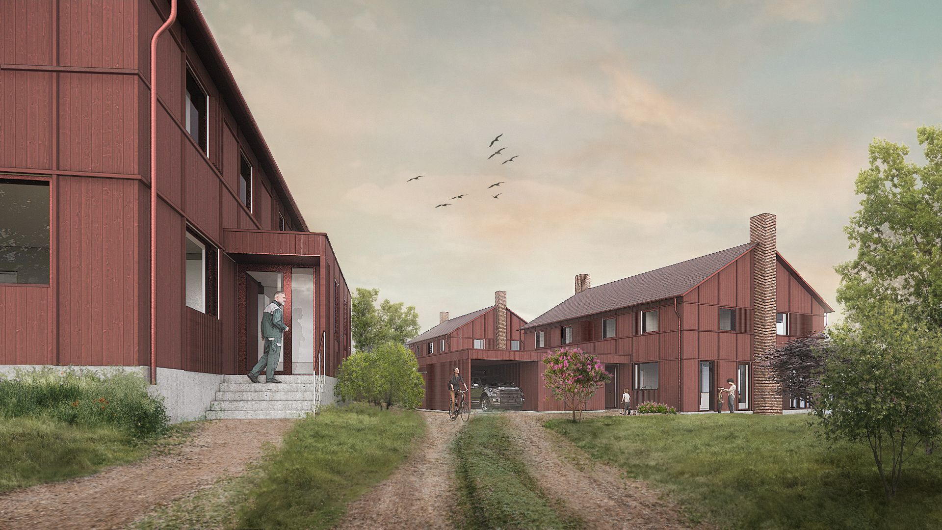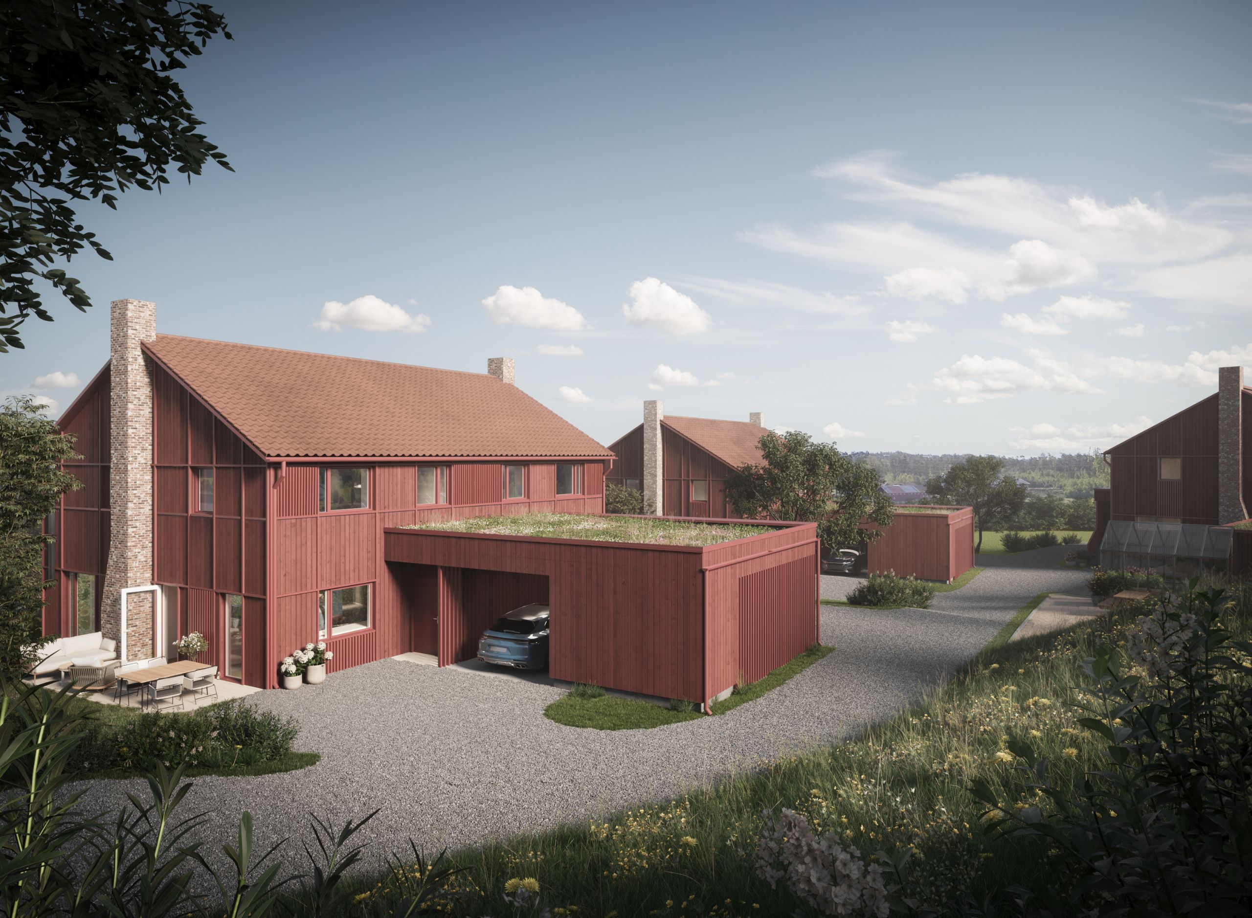 Hvert hus får utvendige carporter overgrodd med sedum, og på østsiden glir de frodige hagene over i oppstykkede parseller tilhørende hver sin bolig, og når du passerer det siste huset, ser du en ganske stor åker som boligene eier i fellesskap, i tillegg til felles veier, drivhus og sandlekeplass.